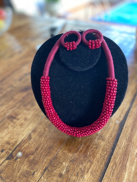 Conjunto de colar e brincos feitos com linha e miçangas na cor Marsala.